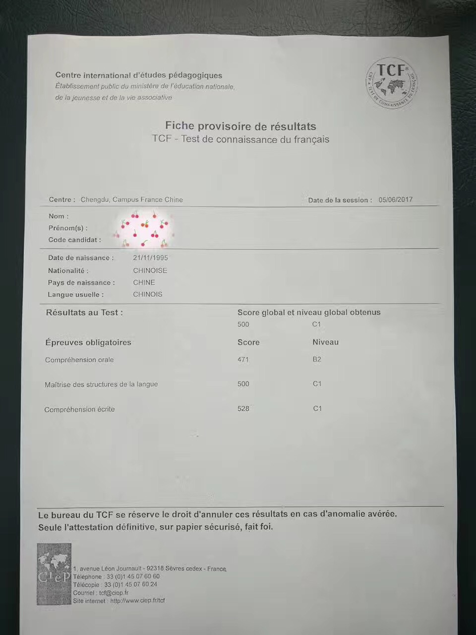 考試類型:TCF所報課程:法語出國班 沒有意外的話,據說馬上就要去格勒二大讀書啦,小亞代表法亞大家祝福你學業有成啦~