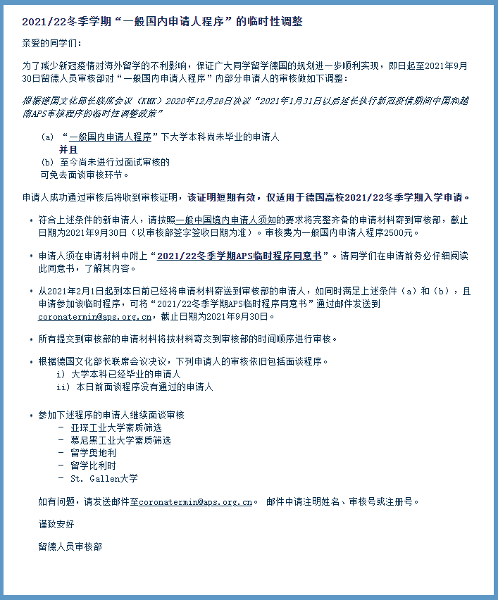 根據德國文化部長聯席會議(KMK)2020年12月28日決議“2021年1月31日以后延長執行新冠疫情期間中國和越南APS審核程序的臨時性調整政策”
