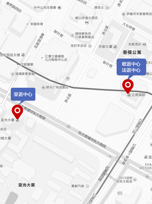 目前,法亞小語種外語培訓學校一共有三個校區亞語中心 ( 日語,韓語,越南語,泰語 )Tel:028——8674 8880Add:成都市錦江區總府路2號時代廣場A座2803(IFS斜對面)歐語中心 ( 德語,西班牙語,意大利語,葡萄牙語,俄語 )Tel:028—8674 5880Add:紅星路三段16號正熙國際27樓(地鐵2號線春熙路站口、蘇寧電器樓上)法語中心(法語)Tel:028—8674 4880Add:紅星路三段16號正熙國際27樓(地鐵2號線春熙路站口、蘇寧電器樓上)人事部Tel:028-86746670/86746690簡歷投遞:fireschool-hr@fireschool.cnAdd:東大街上東大街段6號藍光大廈20樓-春熙路南口、西南書城旁邊合作洽談語言市場合作:15982259365(李老師)留學市場合作:15982259365(李老師)Add:東大街上東大街段6號藍光大廈20樓-春熙路南口、西南書城旁邊