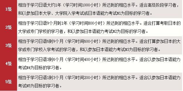 在各級別的考試中,1級、2級分為“語言知識(文字?詞匯?文法)?讀解”、“聽解”2個部分;3級、4級、5級分為“語言知識(文字?詞匯)”、“語言知識(文法)?讀解”“聽解”3個部分。