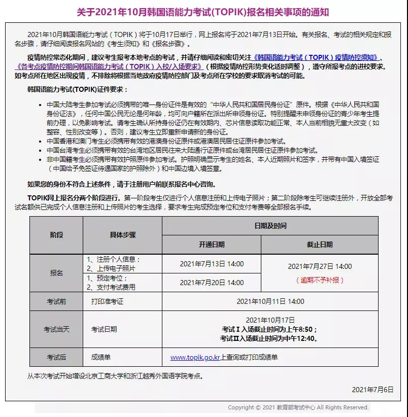 昨天,官方公布最新資訊,確定76屆TOPIK中國大陸考試日程發布《關于2021年10月韓國語能力考試(TOPIK)報名相關事項的通知》,通知內容如下: