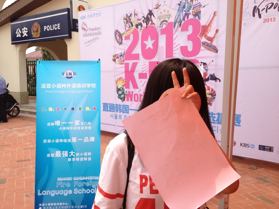 7月20日,2013 K-POP World Festival中國西南區選拔賽在成都國色天鄉三期陸地樂園進行了第一輪比賽,我校韓語班學員熊悅如、邱煜等多名同學成功晉級復賽,祝她們好運